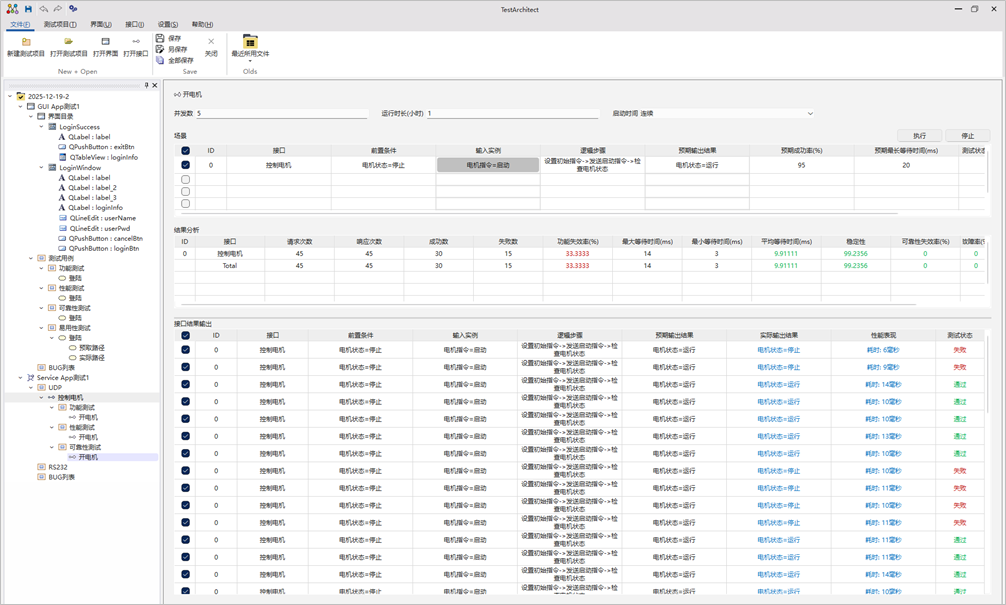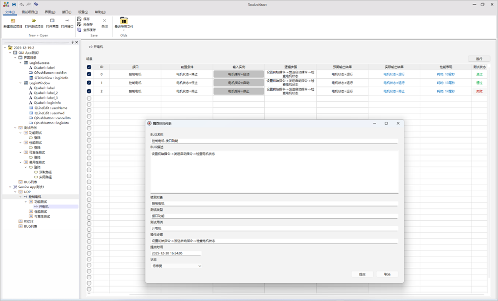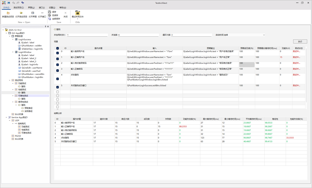 2) 基于测试架构进行功能测试、性能测试、可靠性测试、易用性测试。包括: