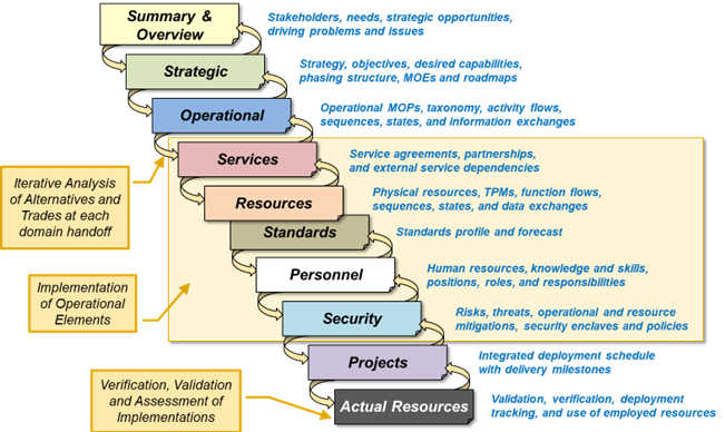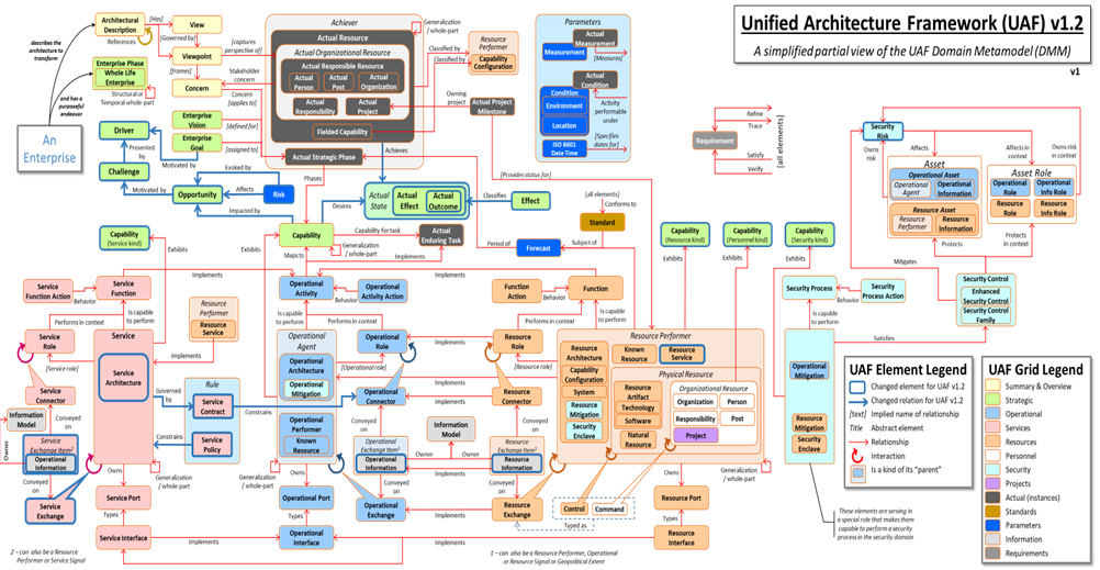 | UAF 具有10个领域,可以采用12个方面建模。基于UAF进行体系架构设计注定是一个复杂而极具挑战的过程。所以UAF提供了架构过程指南,为体系架构设计者提供建模路线图。 |