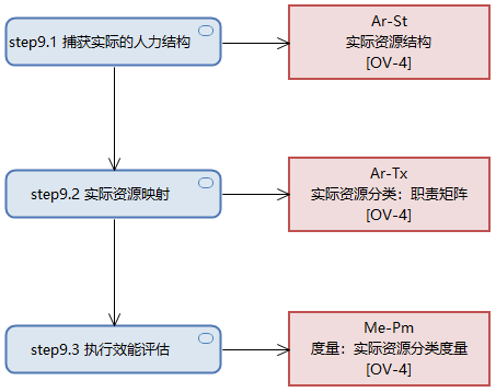 从步骤 5 中提出具有相关人力资源接口及其运行实现上下文的资源架构。现在使用各种组织资源执行者(例如,组织、职位、人员和职责)来检查运行和资源架构,以便进行人员实现。 |