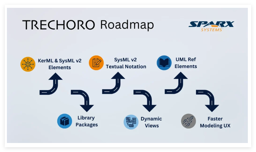 Trechoro 在 2025 年 Sparx Systems 全球峰会上推出,提供干净、高性能的 SysML v2 体验:原生 KerML 对齐、无 UML 内部结构以及同步图形 + 文本创作。通过 Sparx Pro Cloud Server 进行渲染加速,使大型分布式存储库保持响应。受控引用维护与现有 UML/SysML 1.x 资产、工作项和审阅的链接。