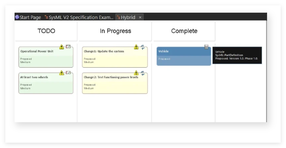 将工作项(用户情景、看板任务、评审、甘特图活动)链接到正式的 SysML v2 构造,而不会污染 SysML2 模型。