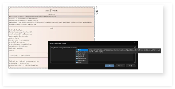 自动完成支持嵌套表达式(例如,dryMass + cargoMass + fuelTank.fuel.fuelMass 在 fuelTank. 之后带有建议,例如 fuel)。