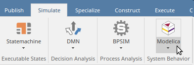 可以将Modelica功能与其他仿真功能方便地组合在一个位置,并且可以使用“仿真”功能区的“系统行为”面板中提供的Modelica / Simulink菜单启动。 Modelica设施使公司拥有其他仿真工具,例如可执行状态机,决策模型表示法和BPSim。