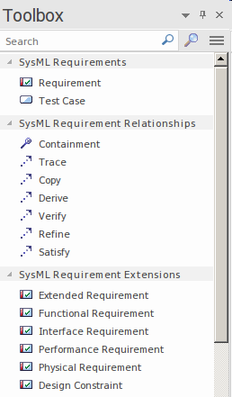 需求图提供了一种可视化需求及其连接的方法。在这些图上可以看到的不仅是两个需求之间的关系,还包括与用例,活动和块等其他类型元素的关系。工具箱中提供的两个元素是: