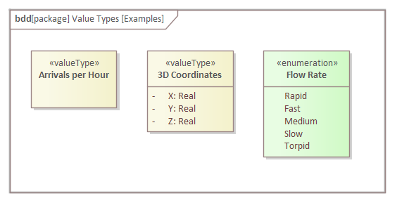 此图显示了许多不同的值类型,可以在Enterprise Architect定义它们,然后将它们应用于在Blocks中定义的任意数量的属性。
