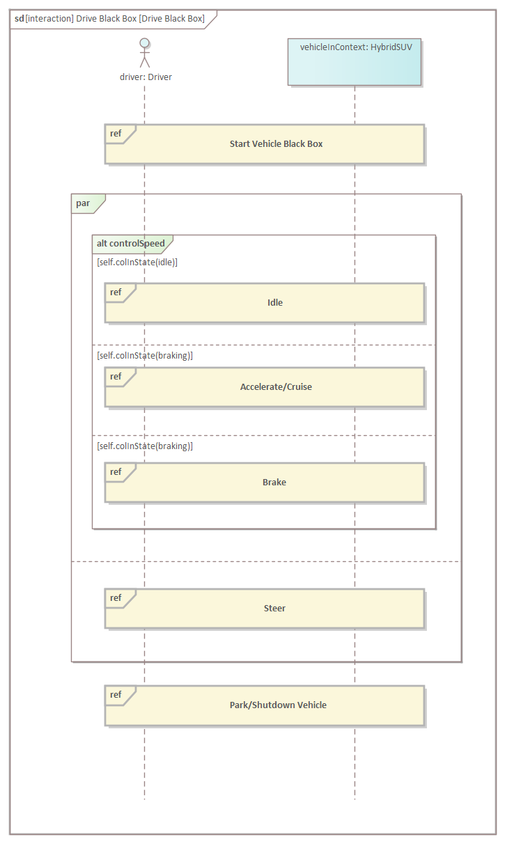 该序列图显示了驾驶员和车辆之间的交互和消息流的序列。该图表示“驾驶汽车”用例的必要交互。交互由“ AutomotiveDomain”块拥有。