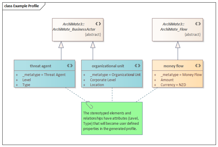 下面的示例显示了将ArchiMate业务角色分为两个元素,以及将ArchiMate Flow关系转化为Money Flow的专业化。例如,组织单位添加了两个用户定义的属性,即: