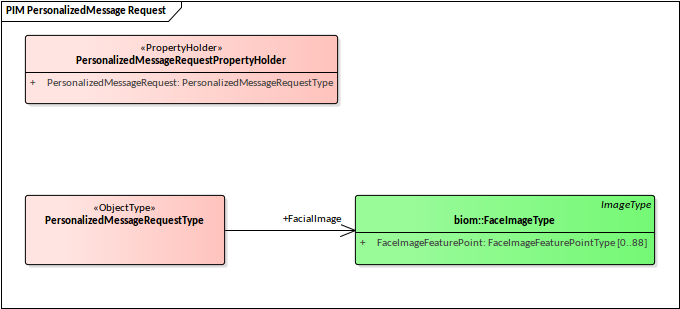 我们的请求消息指定它将发送用于面部识别的面部图像。为此,我们需要从Biometrics Package中将适当的类型子集化。首先在NIEM 4.0参考模型内的Domains \ Biom包中找到FaceImageType类型。将此类型拖到Schema Composer中。继承自该类型的超类型将自动添加到Schema Composer。