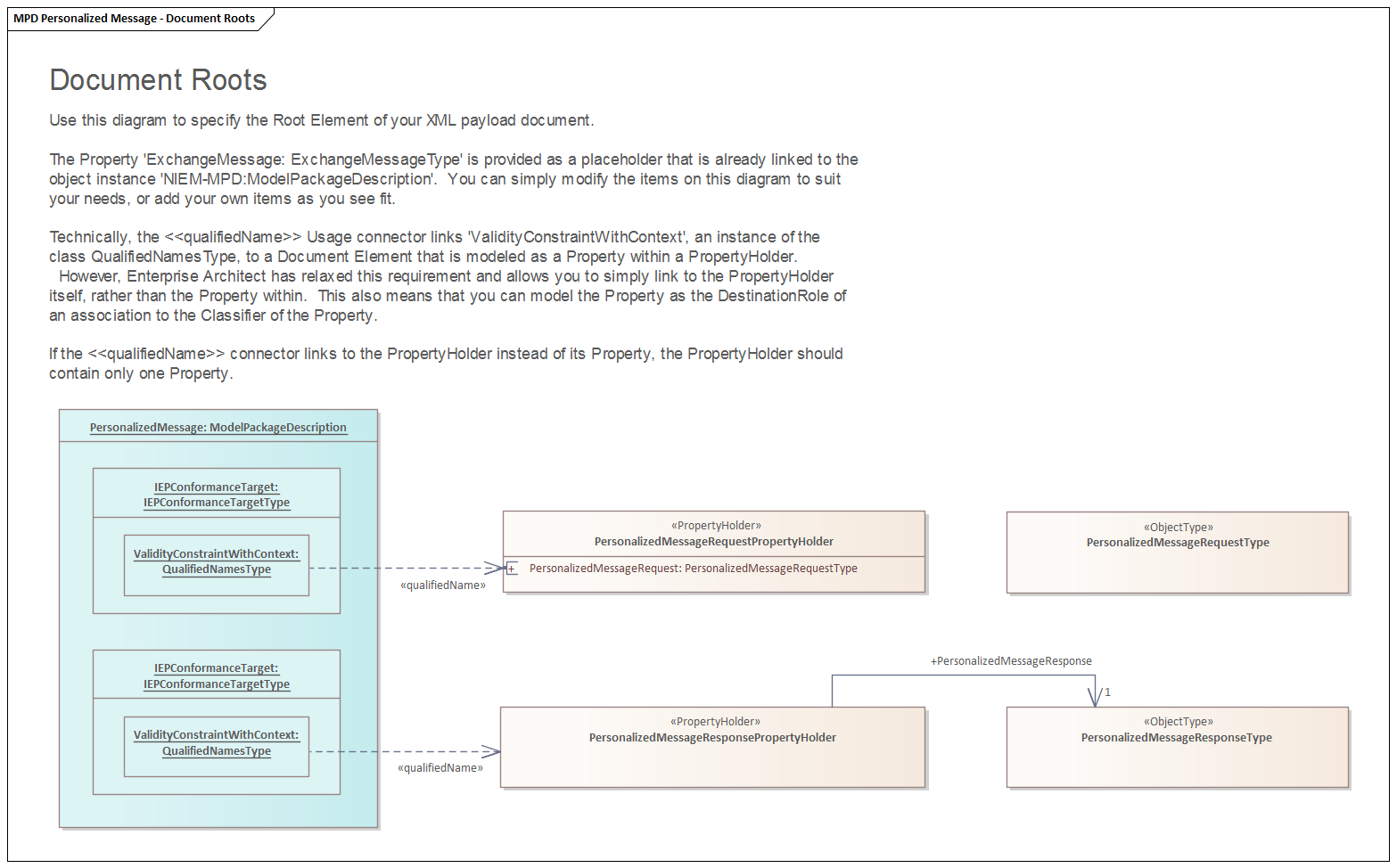IEPD有望定义一种或多种文档类型。每个实例将是一个名为“ IEPConformance Target”的IEPConformanceTargetType实例。提供的模型模式已经包括其中之一,但是我们需要第二个模型,如下所示: 请注意QualifiedNamesType的实例,其与PropertyHolder具有qualifiedName关系。这指定正在描述的文档的顶层将是所包含属性之一的元素。 “ 创建NIEM数据模型 ”主题中的“ 创建扩展包 ”部分介绍了如何定义它。现在,空类型就足够了。 |
