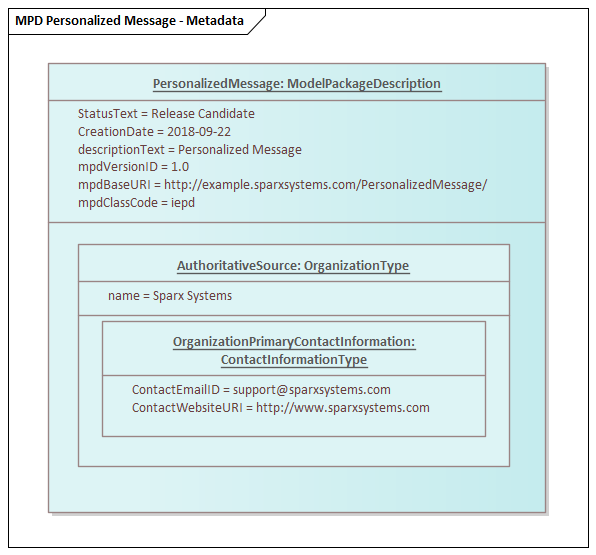 以前,已经描述了NIEM建模所需的框架软件包。模型向导还提供了一个程序包,可作为定义MPD的便捷起点。将其导入模型后,您将找到一个包含MPD类型实例的图,其运行状态设置为显示您最可能需要设置的核心属性。