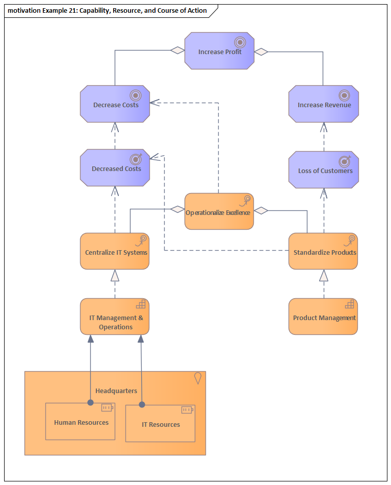此图与增加利润的总体目标有关,该目标由另外两个目标(可以认为是目标)组成,即降低成本和增加收入。然后,对影响目标交付的两个结果进行建模。业务架构师已对影响这些结果的两个“行动方针”要素进行了建模。 “行动方针”要素由两个功能实现,其中一个功能在总部分配了两个资源。