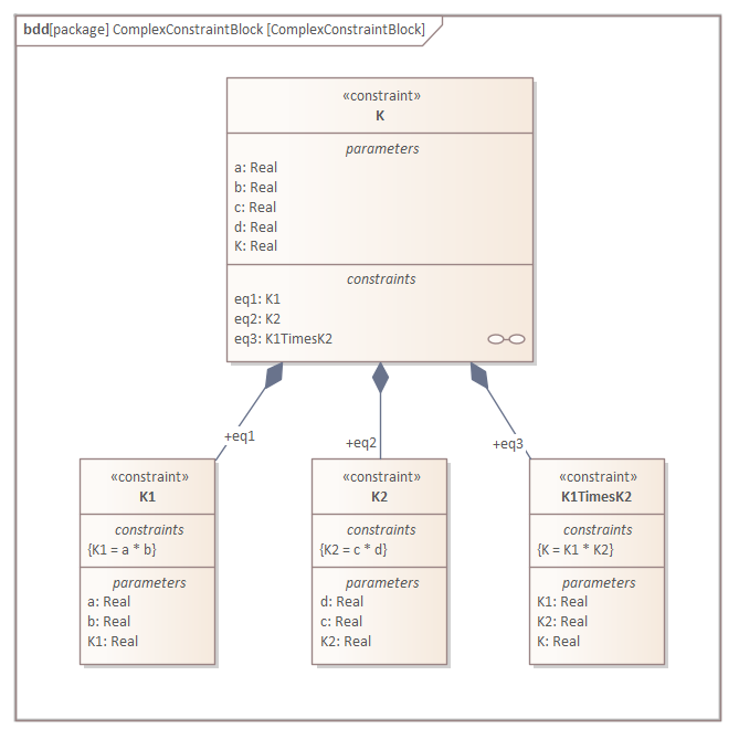 在此示例中,约束块K本身没有定义任何约束,但是作为复合结构从约束的三个组成部分约束块K1 , K2和K1TimesK2继承它们。约束块K继承了五个参数a,b,c,d和K。
