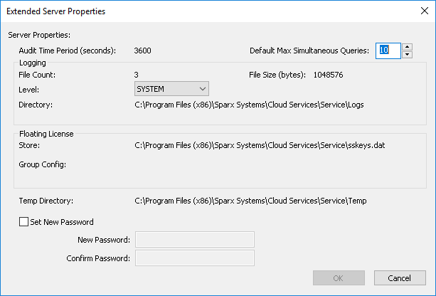 单击主屏幕上的“扩展属性”按钮时,将显示“扩展服务器属性”屏幕。它可以帮助您配置应用于Pro Cloud Server的全局选项。这些选项中的每一个都可以在配置文件中进行设置。但是,如果使用此屏幕更改了选项,则该服务不需要重新启动。