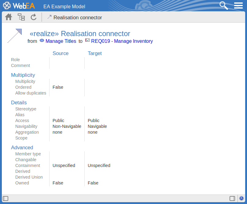 当您单击关系箭头时(例如,在示例中,从“管理标题”到“ REQ019-管理库存”箭头),将显示“关系属性”屏幕。