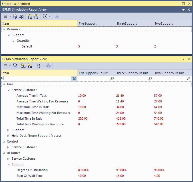 - 这两个支持资源-他们忙吗?如果不是这样,我们可能必须更改流程以使用所有时间并减少客户的等待时间。但是,“利用率”为98%,这表明资源几乎没有空闲时间