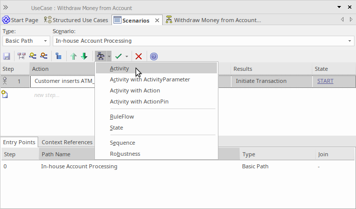 当您在元素上创建方案,然后从方案中生成活动图时,活动将作为所选元素的子级生成,以充当该图的容器。