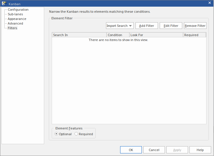 Setting filters on a Kanban Diagram in Sparx Systems Enterprise Architect.