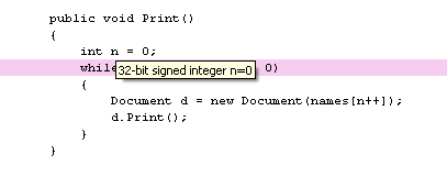 发生断点时,您将在该窗口中看到所有局部变量。您也可以通过将鼠标悬停在引用上来检查源代码编辑器中的变量。这里有些例子。